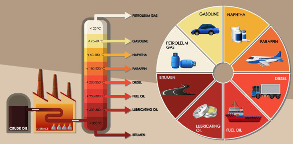 The crude oil is refined in oil refineries. It is carried out by the process of fractional distillation. Components of crude oil is separated on the basis of boiling points.